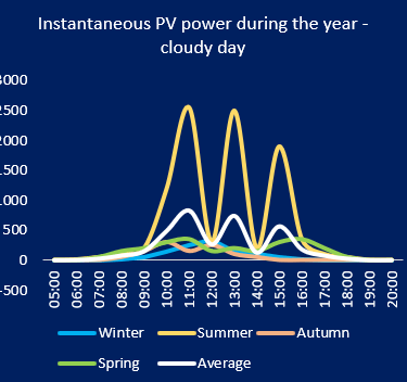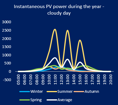 Sunny days are characterized by a pronounced midday “peak,” the height of which changes depending on the season. In contrast, cloudy days introduce much greater variability, with sudden dips and short-lived peaks, making production forecasting significantly more challenging. This variability and the substantial reduction in output during overcast periods are illustrated in the figure below.