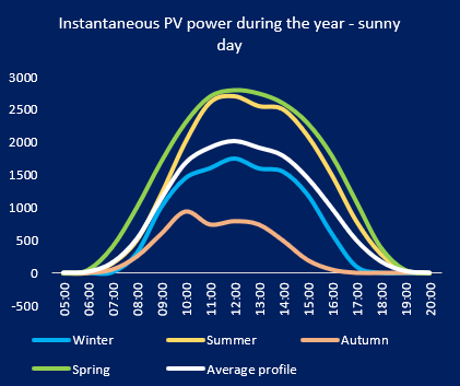 Analysing average PV generation profiles over the course of a year clearly shows that optimizing self-consumption within a cooperative is not straightforward. Energy production varies not only with the time of day but also across seasons and under different weather conditions. The figure below illustrates PV output for a typically sunny day, showing both seasonal variations and an averaged profile.